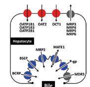 Kvantitativně významná hepatobiliární exkrece vyžaduje velmi vysoké koncentrace léčiva nebo metabolitu ve žluči. Průtok krve játry činí 1,5 l/min (75 % v. portae a 25 % a. hepatica), zatímco objemový tok žluči je pouhých 0,6–0,8 ml/min. Na žlučovém pólu hepatocytu se jednosměrného aktivního transportu účastní transportéry ze skupiny ABC (viz obr. 3.13). Látky vylučované ve žluči do střeva musí mít afinitu k těmto transportérům a nesmějí být schopny pasivní difuzí proniknout ze žlučových cest a žlučníku do krve v periduktálních cévních plexech, přestože koncentrace ve žluči převyšuje koncentraci v krvi stonásobně i více. Hepatobiliární exkrece se významněji podílí na eliminaci látek s molekulovou hmotností > 500 a s amfifilním charakterem, tj. obsahujících lipofilní část a zároveň skupinu nesoucí elektrický náboj (viz tab. 3.11). Prototypem je bilirubin a z exogenních látek např. barviva bromsulfoftalein nebo indocyaninová zeleň, která se dříve používala k vyšetření exkreční funkce jater. Konjugace léčiv a metabolitů I. fáze mění vlastnosti molekuly na výhodné pro hepatobiliární exkreci. Například glukuronidace zvyšuje molekulovou hmotnost o 193 Da a konjugace s glutathionem o 306 Da a molekula získává záporný náboj. Samotný glutathion je také významně vylučován játry do žluči.