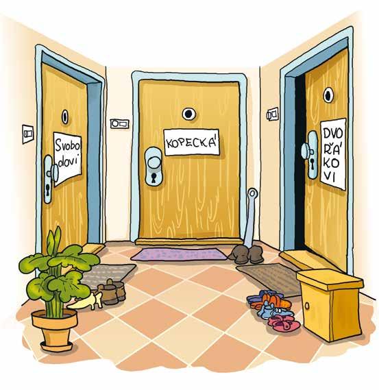 Dveře napravo jsou od našeho bytu. Uprostřed bydlí naše sousedka, paní Kopecká, a ve dveřích vlevo bydlí manželé Svobodovi.