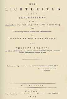 válečný chirurg frustrován častou neschopností nalézt v hloubce rány uložený projektil u poraněného vojáka. Promýšlel tedy různé možnosti jak tento problém vyřešit. Zrodil se jeho „Lichtleiter“ (světlovodič) (obr. 1.2). Zdrojem světla byla hořící svíčka, duté zrcadlo směrovalo světlo do tubusu, čočka sloužila k pozorování. Bylo možné vyšetřovat uretru a močový měchýř u žen, rektum, pochvu a cervix, nazofarynx, zvukovod, dutinu ústní i trajektorii projektilu. Pozorování močového měchýře u mužů bylo možno provádět až po cystotomii. Charakteristiku instrumentu nastínil Bozzini již v roce 1804 v lokálních frankfurtských novinách a dával mu publicitu i mezi kolegy. První odborná publikace vyšla v roce 1806, následující ve Výmaru rok poté – jednalo se již o monografii s novým obsahem a ilustracemi, které pořídil sám autor (obr. 1.3).