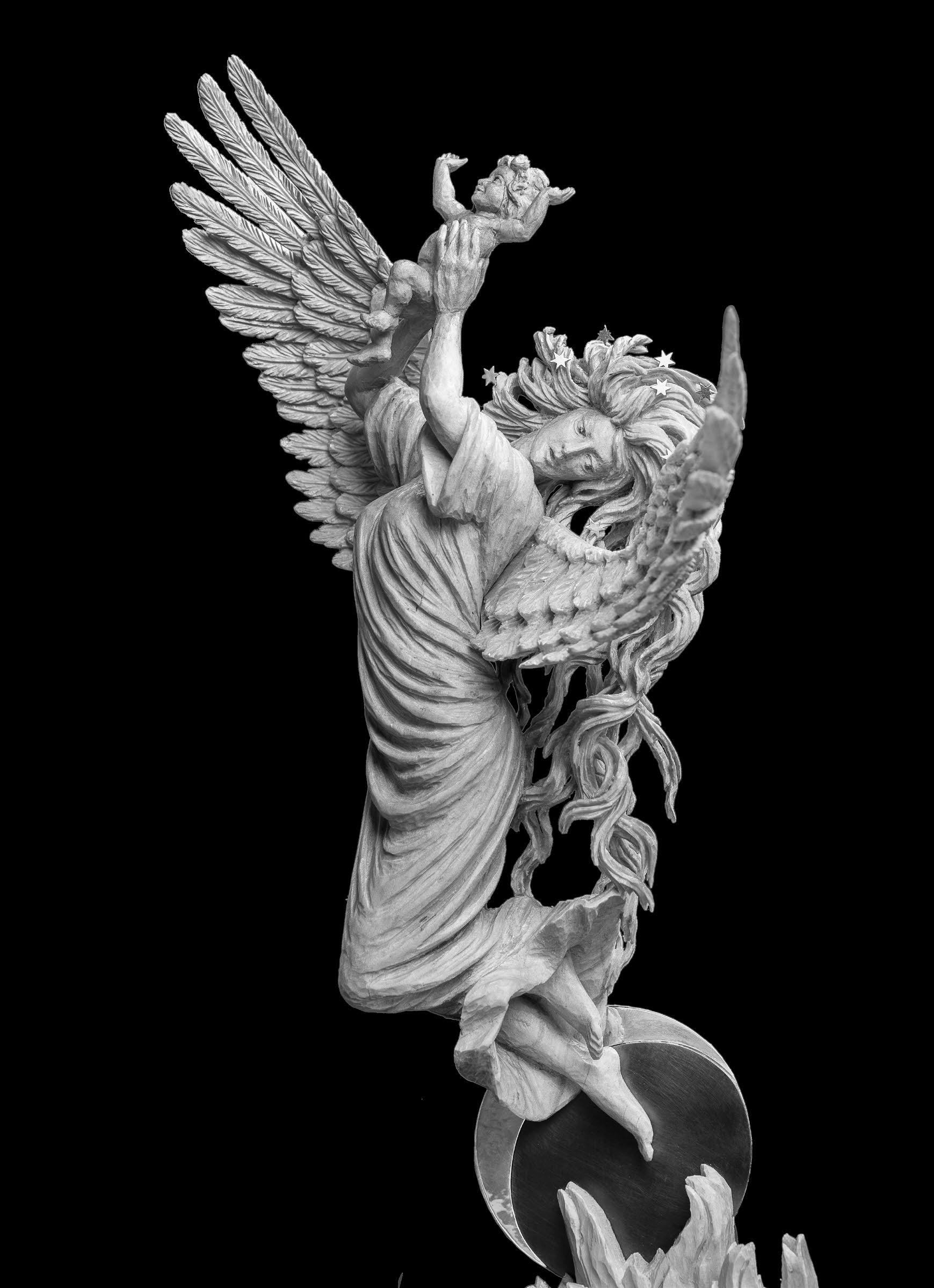 f) Konzola, jedna k páru, okřídlená bohyně, výška 50 cm, zlacená, počátek 20. století, Indonésie