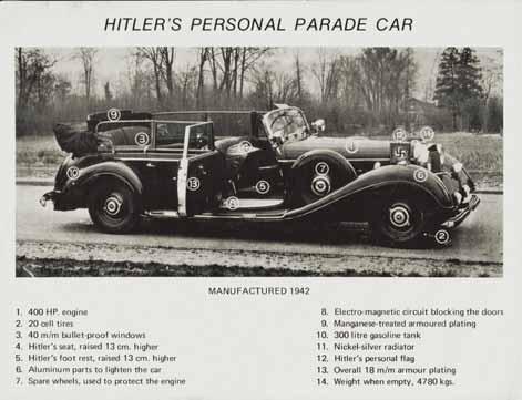 legedly raised to 400 horsepower. Tires with 20 chambers made it possible to continue driving even after a bullet hit the tire and the 40-millimetre-thick window glass protected passengers from external threats. An electromagnetic circuit worked as the central lock and the car’s supposed unassailability rested upon steel armoring with manganese alloys with a material thickness of 18 mm. The high weight of the car was compensated for by components made of aluminum alloys. The position of Hitler’s seat and leg rests was 130 millimeters higher, so that the crowds could see him well. A similar setup is known from the “Popemobiles”. The dictator also had at least three closed cars of type 770, with a weight of 3,600, 4,100, and 4,780 kg respectively depending on the armoring.