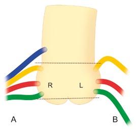 Obr. 1-14 Variace odstupů pravé a levé věnčité tepny. Pravá věnčitá tepna může odstupovat – z pohledu vertikální osy –ze sinusu normálně (červená), vysoko v sinusu (oranžová), nízko v sinusu (zelená) nebo vysoko mimo sinus, distálně od STJ (modrá) (A). Levá věnčitá tepna může kromě normálního odstupu (červená) odstupovat vysoko se sklonem nahoru (oranžová) nebo nízko se sklonem dolů (zelená) (B).