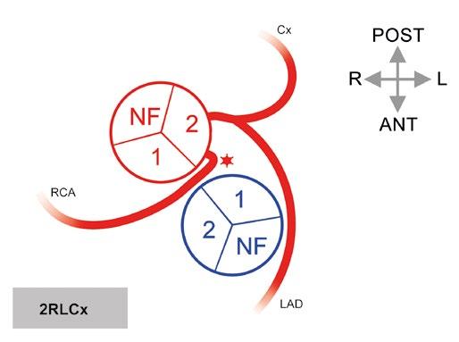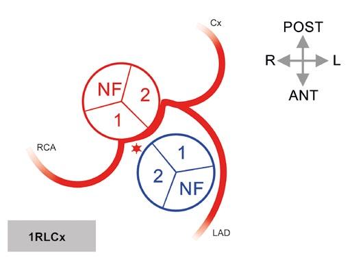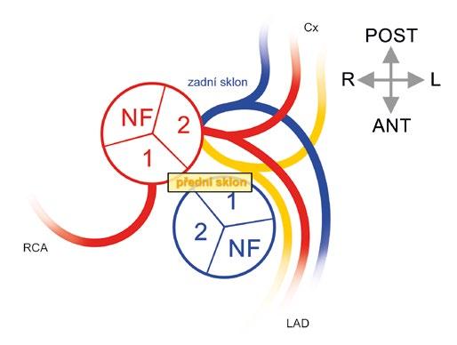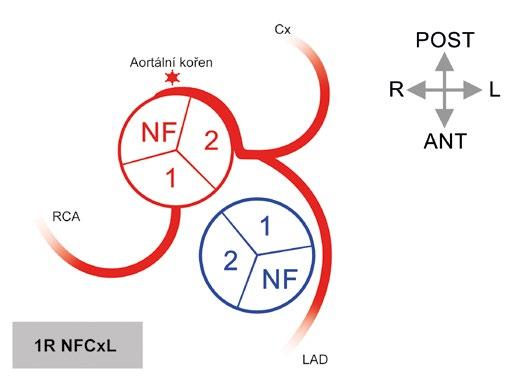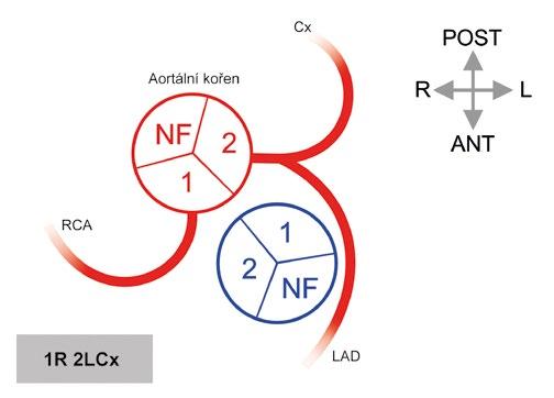 R, L, NF – pravý, levý a „non-facing“ aortální sinus; RCA – pravá věnčitá tepna; LCA – levá věnčitá tepna; pravá SANB – pravá větev pro sinoatriální uzel (pravosíňová větev);