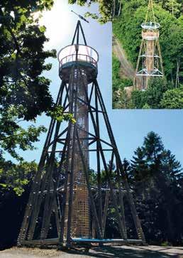 dřevěná rozhledna s kovovými prvky, ve tvaru trojbokého jehlanu se zavěšeným schodištěm
