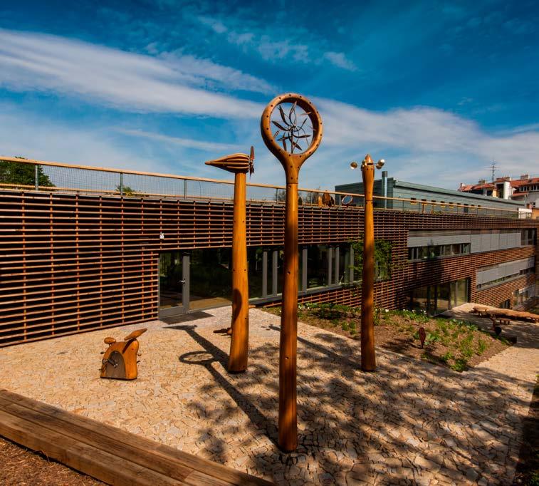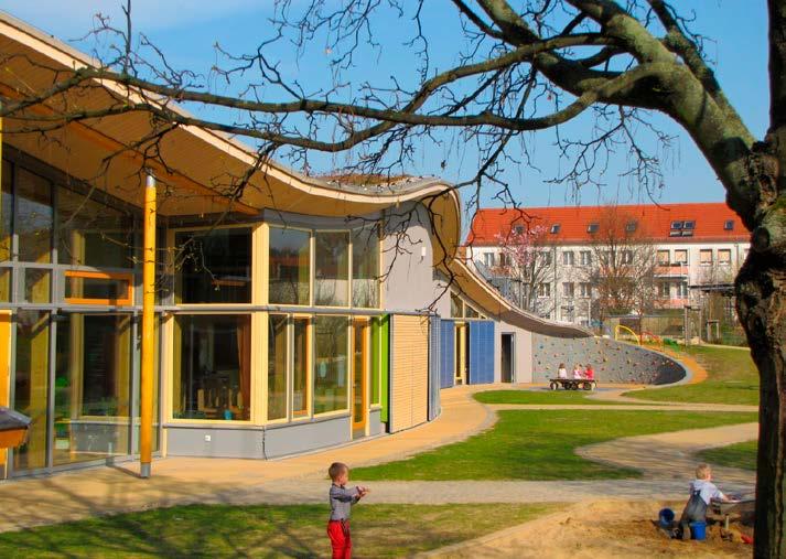 1-2 Pasivní mateřská školka v Drážďanech s organickými tvary a zelenou střechou připomínající původní terénní reliéf (Architekt: Olaf Reiter. Foto: CPD)