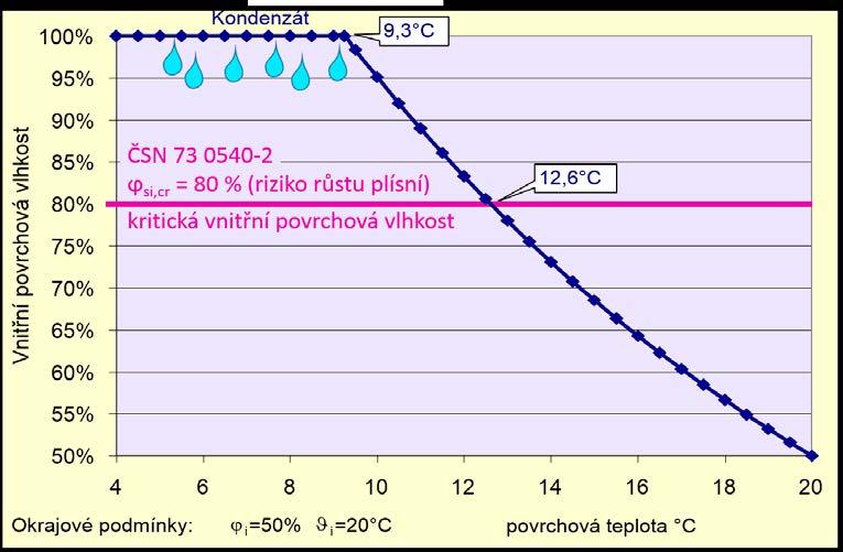 Pro množení a růst plísní ovšem není nutná přímo kondenzace vlhkosti, jak je často mylně prezentováno. Norma ČSN 73 0540-2 uvádí jako kritickou vnitřní povrchovou vlhkost ve výši 80 %, při níž již hrozí riziko růstu plísní, viz obr. 2-7. Při vnitřní relativní vlhkosti vzduchu 50 % a vnitřní teplotě 20 °C je této hraniční hodnoty dosaženo již od povrchové teploty 12,6 °C.