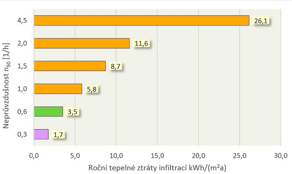 2-25 Vliv neprůvzdušnosti na roční tepelné ztráty infiltrací pro běžný rodinný dům (Zdroj: CPD)