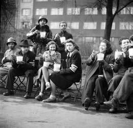 Následky náletu na Prahu 14. 2. 1945 pomáhala odstraňovat i mládež z Kuratoria pro výchovu dětí a mládeže a tzv. oddílů Zvláštního zasazení. Fotografie vznikla na Karlově náměstí při polední přestávce.