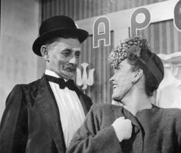 Vlasta Burian a Zita Kabátová před výlohou firmy Papež ve filmu Zlaté dno režiséra Vladimíra Slavínského, 1942.