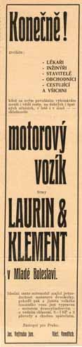 zkušební jízdě. Jejich snaha vedla k cíli. V neděli 18. listopadu 1899 představil Václav Klement zástupcům tisku na Bubenské dráze v Praze dva motocykly Laurin & Klement Slavia typ A o výkonu 1¼ k za 460 zlatých a typ B o výkonu 1¾ k za 500 zlatých. Novináři se nadchli, avšak zákazníků bylo jako šafránu. Nicméně pánové Laurin a Klement se jednou provždy vydali na cestu, z níž nehodlali sejít. Sotva prodali pár motocyklů, začali přemýšlet o dvoustopém vozidle. Klement v Paříži přece viděl, kam směřuje vývoj. Nutno ovšem zmínit také Laurina, nadmíru skromného společníka, který nejen souhlasil s Klementovými vizemi, ale vedl práce na jejich realizaci, zejména v prvních kritických letech.