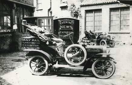 Vzácný snímek z Londýna, kde voituretty dovážené firmou Hewetson sloužily jak k rozvozu novin (jak dosvědčuje vůz vpředu), tak jako automobily běžných zákazníků (vůz vzadu u okna)