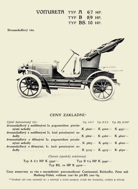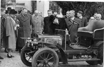 Vděčný objekt při výjimečných oficialitách: Nad vozem se sklání prezident Edvard Beneš při návštěvě automobilky v roce 1946, vedle něho vpravo Ing. Alois Hrdlička, tehdejší ředitel automobilky, stojící nad chladičem ing. Vilém Frinta, závodní ředitel Ceník prvních dvouválcových typů