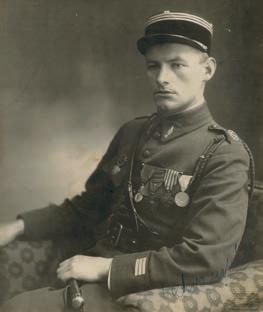 Kapitán Augustin Charvát v uniformě francouzského letectva po návratu do vlasti v roce 1919. Francouzský pilotní odznak nad klopou pravé kapsy a límcové označení příslušníků francouzského letectva doplňují na stejnokroji i prvky čs. legionářů ve Francii, a to malý kovový legionářský odznak a nárameníky s nášivkou opatřenou iniciály ČS. Repro sbírka autorů via Čejka. Captain Augustin Charvát in French Air Force uniform after returning to Czechoslovakia in 1919. French pilot badge above right breast pocket and French Air Force collar insignia are complemented by insignia of the Czechoslovak Legion in France, i.e. small metal legionary badge and shoulder boards with ČS initials. Copy author’s collection via Čejka.