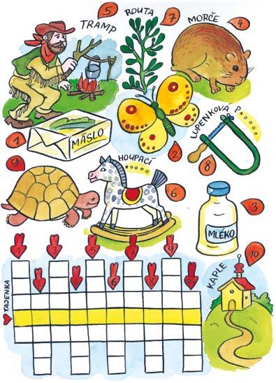 Doplň do hřebenovky slova podle označených obrázků, piš svisle ve směru šipek. Ve žlutých políčkách se skrývá tajenka.