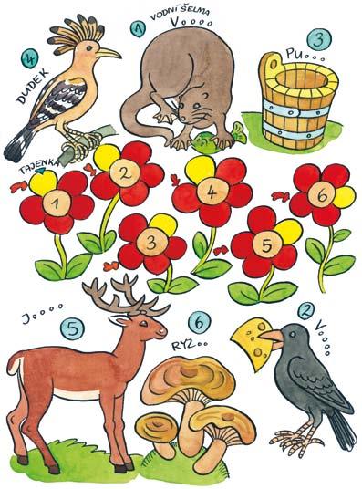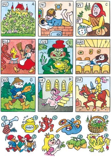 Přiřaď pohádkové obrázky dole na stránce ke správné pohádce. Podle pořadí čísel pak sestav ze slabik tajenku.