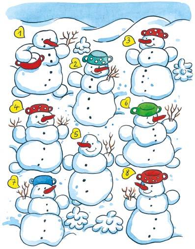 Jenom dva sněhuláci mají koště, puntíkovaný hrnec, pět knoflíků a usmívají se. Kteří to jsou?
