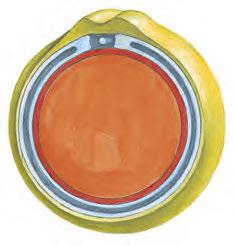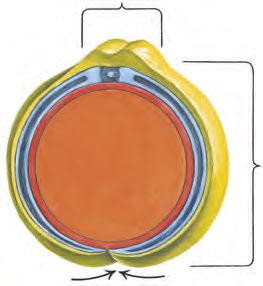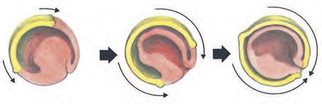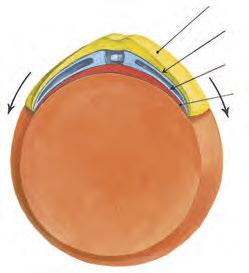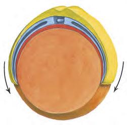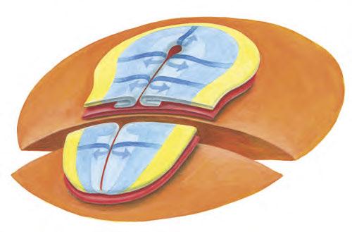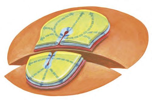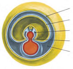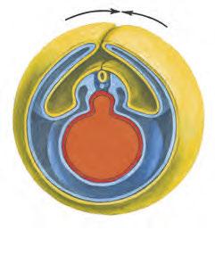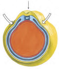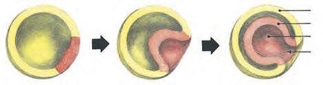 obr. 47. VStUP cHoRDomeSoDeRmoVÉHo mateRiáLU mezi eKtoDeRm a entoDeRm záRoDeČnÉHo teRČÍKU u Sauropsid (schematický model) žlutě – ektoderm, červeně – entoderm, modře – mesoderm, oranžově – žloutek a zárodečný terčík modelově oddělený od žloutku b, c začátek a závěr postupu chordomesodermového materiálu (označeného modře) mezi ektoderm a entoderm terčíku (znázorněno též na příčném řezu)
