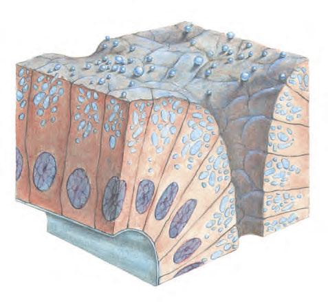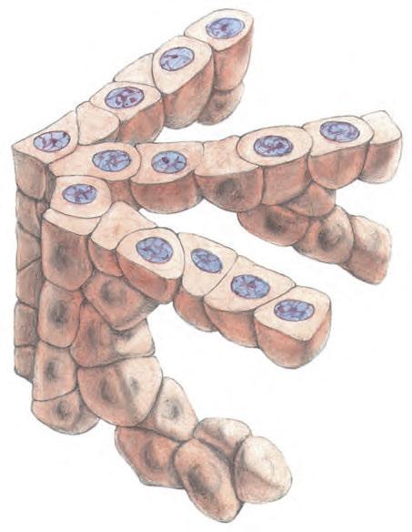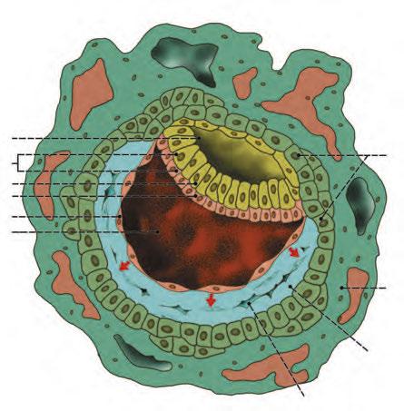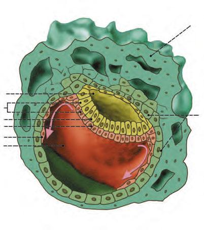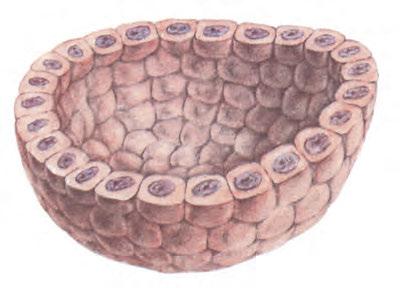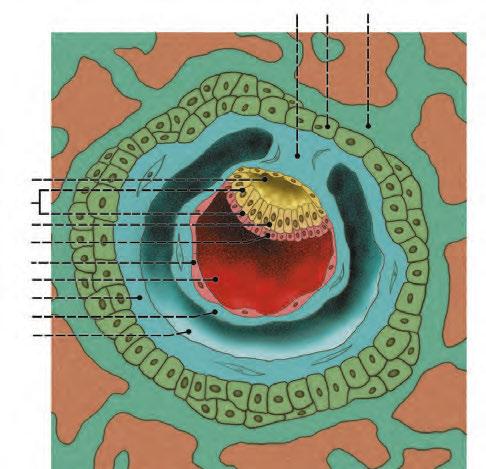 Po 4. dnu vývoje přechází morula zvejcovodu do dělohy. Vmorule se vytvoří dutina; vnější buňky vytvářejí obal dutiny, nazývaný trofoblast (řec. trofé, výživa), vnitřní buňky jsou přisedlé jako hrouda na jednom místě ktrofoblastu anazývají se embryoblast. celý útvar se nyní označuje jako blastocysta (obr. 51). od 6. do 7. dne po oplození se blastocysta postupně zanoří do sliznice dělohy (obr. 50). tento děj se nazývá nidace vajíčka (uhnízdění, lat. nidus, hnízdo) aprobíhá vkombinaci invasivního růstu apůsobení proteolytických enzymů produkovaných trofoblastem, které rozruší buněčná spojení epithelu děložní sliznice. blastocysta se do sliznice zanořuje pólem, při kterém je embryoblast. Buňky trofoblastu se 8. dne vývoje diferencují ve dvě vrstvy. Vnitřní vrstva se skládá z jednolivých buněk a označuje se jako cytotrofoblast. Zevní vrstva ztrácí hranice mezi buňkami, které splývají vmnohojaderný útvar zvaný syncytiotrofoblast. začíná se na blastocystě tvořit v místě embryoblastu a postupně se šíří kolem celé blastocysty (obr. 52–54) tím, že do něho migrují a navzájem splývají buňky cytotrofoblastu.