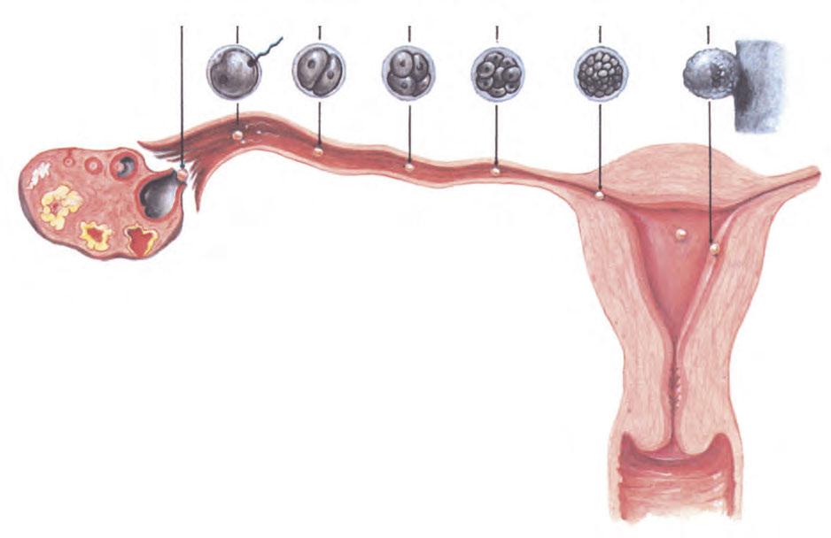 obr. 50. ČaSoVÝ SLeD RÝHoVánÍ a VzniKU bLaStocYStY u člověka a postup oplozeného vajíčka do dělohy k nidaci (schema)