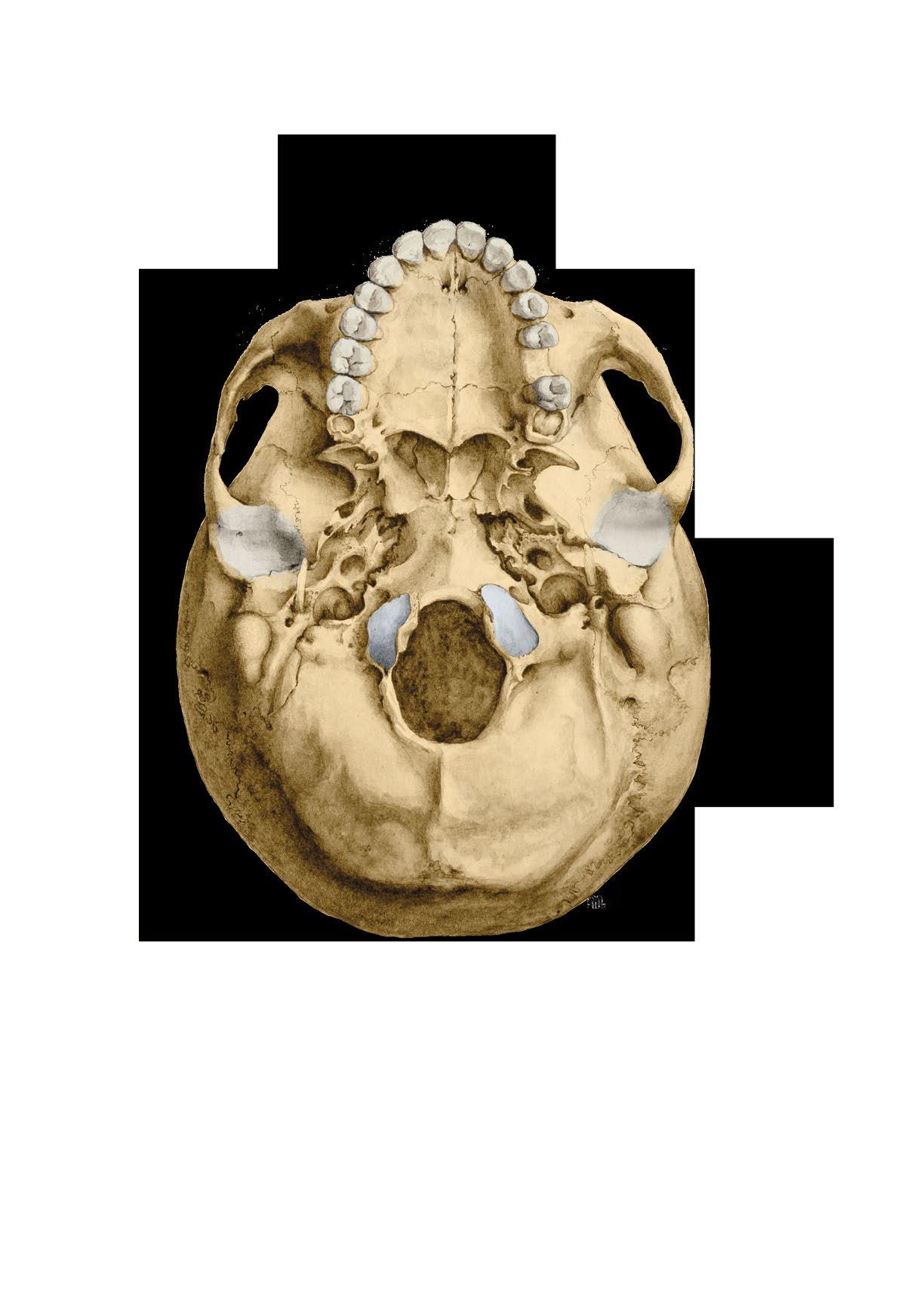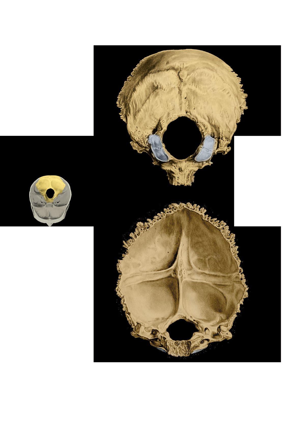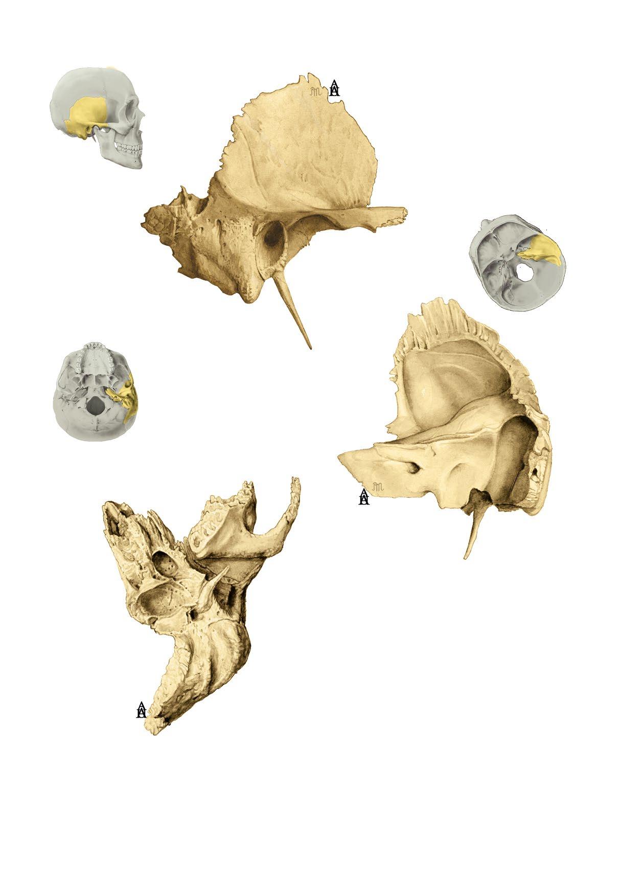 Os temporale, kost spánková a pohled z laterální strany b pohled z mediální strany c pohled zdola