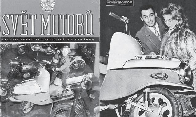 První představení prototypu skútru Čezeta v prvomájovém průvodu ve Strakonicích. (zdroj: Svět motorů č. 11/1956 z 24. 5. 1956)