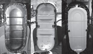 Nejen zavazadelníky, ale i plechy sedaček prošly vývojem. Od prvních (vlevo), které neměly výztuhy, přes výztuhy z pásků plechu (uprostřed) až po výztuhy z plechových profilů (vpravo)