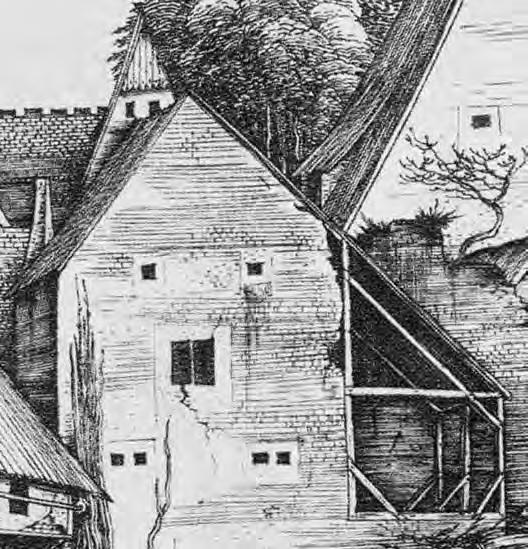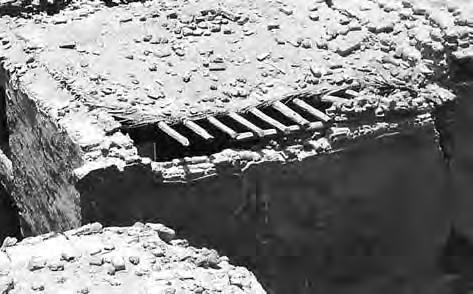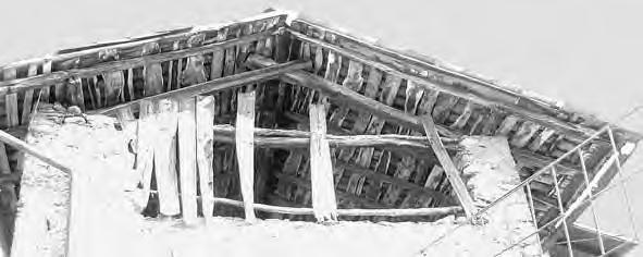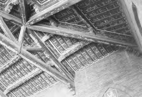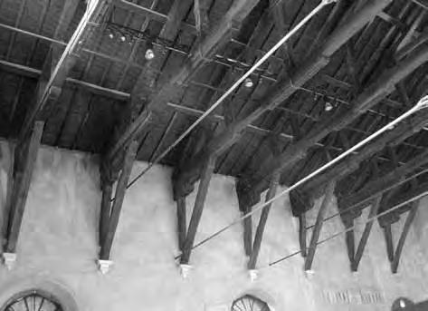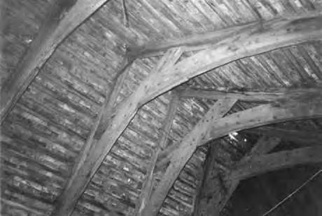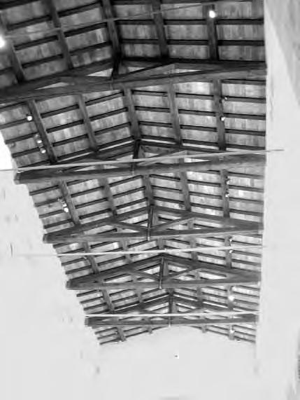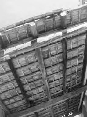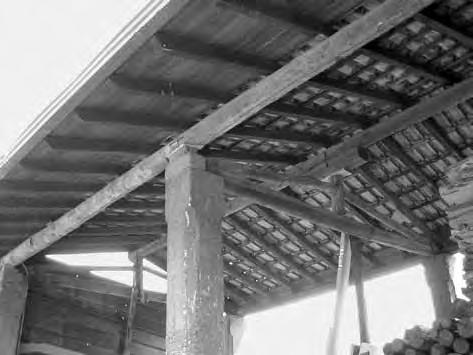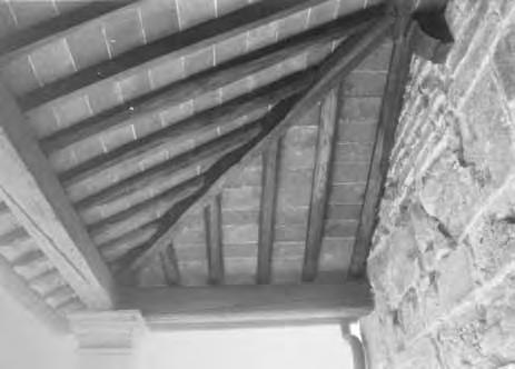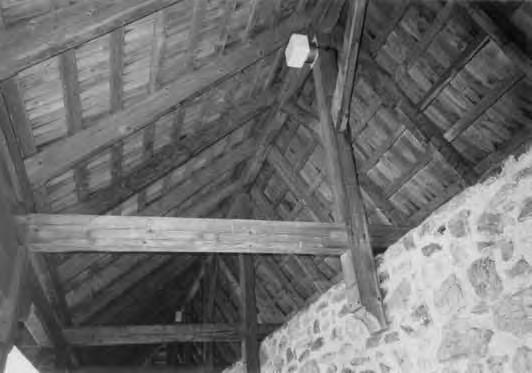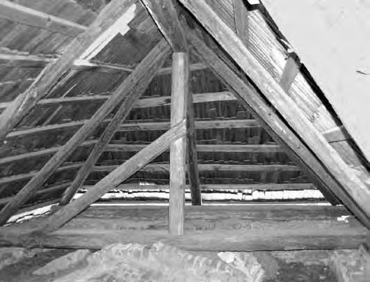 Otevřená konstrukce střechy. Střešní roviny o malém sklonu mají konstrukci stejnou jako ploché střechy (viz kap. 3.1) tvořenou vodorovnými nosníky a svislými latěmi (krokvičkami). Vodorovné nosníky jsou prostřednictvím krátkých sloupků opřeny na příčné trámy se vzpěrami zapuštěnými do přízedních příložek opřených o kamenné konzoly. Zastřešení je odvozeno z konstrukcí stropů, vazby podpůrné konstrukce mají charakter vazníků, proto je zařazujeme do této kapitoly.
