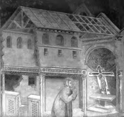 Pistoia (Toskánsko, Itálie), San Francesco, Dalmasio: Historie sv. Františka, fresky před 1343 [Gai, 1993] Příhradový vazník nese okapní, střední a hřebenovou vaznici, krytina z plochých pánví a kůrek je položena na svislé latě.