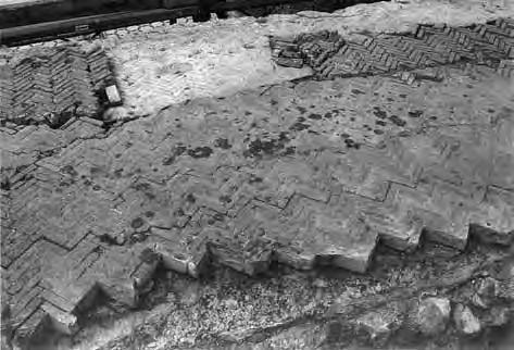 Skladba antické krytiny: ploché pánve se zdviženými okraji (tegulae) kryté kůrkami (imbrices).