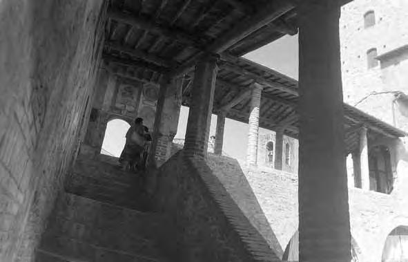 S. Gimignano (Toskánsko, Itálie), palácové schodiště, 16. (?) stol., sklon ~ 15° Sedlová střecha (v pozadí). Hustě kladené krokve z tyčoviny (latě) jsou podepřeny hřebenovou vaznicí a osedlány na okapové vaznice. Vaznice jsou uloženy na příčné trámy podepřené zděnými pilíři, hřebenová vaznice je podepřena krátkým sloupkem. Konstrukce má charakter položené střechy (viz též S. Gimignano, tabule 3).