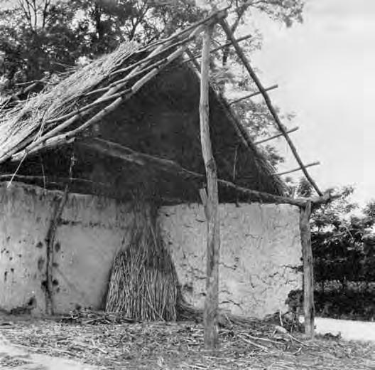 Kůly zaražené do země nesou okapní vaznice osazené do rozsochy, hřebenová vaznice (slemeno) je osazená do vidlice sloupu (sochy) stojícího v čele štítu. Krokve jsou ke slemeni vázány houžvemi, neleží vždy proti sobě, nejsou vzájemně svázány –položená (zavěšená) střecha. Stavba provizorního charakteru je z kulatiny a tyčoviny z listnatého dřeva.