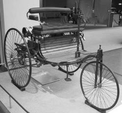 Dvoudobý plynový spalovací motor konstruuje v roce 1879 K. Benz (1844–1929). Proslavil se však až svými automobily se spalovacími motory vlastní konstrukce. První tříkolové vozidlo (obr. 1.9) vyjelo z Benzovy dílny na jaře roku 1885. Poprvé ujel Benzův vůz 100 metrů, po několika týdnech ujel již trať dlouhou jeden kilometr a dosáhl rychlosti 11 km za hodinu. Teprve třetí model mu přinesl pronikavější úspěch. Patent na toto vozidlo obdržel v lednu 1886.