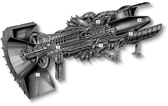 Obr. 1.16 Spalovací turbína (1-vstup vzduchu, 2-kompresní sekce, 3-spalovací prostor, 4-turbínová sekce, 5-výfuková sekce, 6-výfukový difuzor). Spalovací turbíny budou podrobněji popsány v připravované publikaci Speciální spalovací motory a vozidla.