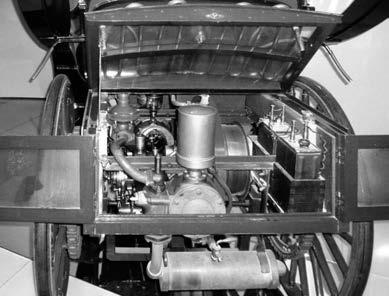 Pod sedadlem v zadní části, v prostoru, který u kočárů sloužil pro zavazadla, byl umístěn dvouválcový ležatý motor Benz (obr. 1.13) o obsahu 2,714 l a výkonu přibližně 5 koní při 600 min-1 (vrtání i zdvih 120 mm). Motor měl automatický sací ventil, výfukový ventil byl ovládán od vačkového hřídele. Směs paliva a vzduchu byla vytvářena v povrchovém odpařovacím karburátoru, do jehož odpařovacích nádob, zahřívaných výfukem, přitékal benzín ze spádové nádrže.