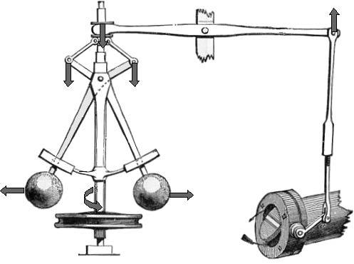 Další zlepšení spočívalo ve vynálezu odstředivého regulátoru (obr. 1.5), který se používal ke stabilizaci otáček parního stroje. Byl zaveden v roce 1782 Jamesem Wattem. Skládal se ze dvou závaží, která rotovala a byla poháněna strojem, jehož otáčky měly být regulovány. Čím rychleji se tato závaží otáčela, tím větší byla vlivem odstředivé síly jejich výchylka od svislé osy rotace. Uvedené vychýlení bylo převedeno na svislý pohyb nad jejich ukotvením, který byl dále pákou a táhlem převeden k ventilu přivádějícímu páru ke stroji. Byla tak realizována mechanická záporná zpětná vazba, která dovolovala působením poměrně malých sil regulovat velmi výkonný stroj. Setkání s parními stroji inspirovalo i další vynálezce, a tak se vozidla s parním pohonem objevila i v jiných zemích: