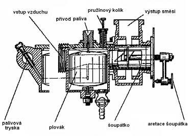 Na zlepšení chodu motoru se v roce 1893 podílí i němec Wilhelm Maybach (1846–1929), vynálezem prvního karburátoru (obr. 1.11) využívajícího na tvorbu směsi paliva se vzduchem podtlaku, vytvořeného v zúženém místě sacího potrubí, odsávajícího kapalné palivo z odměřovací trysky, tedy principu novodobých karburátorů.