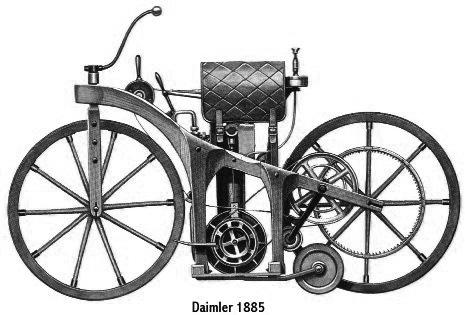 Nevýhodou Ottových motorů byl malý výkon a vysoká hmotnost. Další z německých vynálezců Gottlieb Daimler (1834–1900) se snažil o zvýšení výkonu motorů zvýšením otáček motoru. Poznal, že základním omezením je nízkonapěťové elektrické zapalování. Řešení nalezl v zapalování pomocí žhavící trubičky. Žhavící trubička procházející stěnou hlavy válce byla zahřívána zvenku malým plamínkem. V průběhu komprese byla čerstvá směs zatlačena do trubičky a tam se od žhavé stěny vznítila. Spolehlivost tohoto zapalování vedla ke zvýšení otáček motoru až na 900 min-1 . Roku 1885 motor zabudoval do stroje dřevěné konstrukce (obr. 1.10), který byl defakto čtyřkolový, ale dvě malá stabilizační kolečka historie pomíjí a prohlašuje tento stroj za první motocykl. Motor byl umístěn vertikálně uprostřed stroje. Zadní kolo bylo poháněno řemenicí přes předlohový hřídel a odtud ozubeným kolem. Zadní brzda byla ovládána otočnou rukojetí na řídítkách. Výfukový ventil se ovládal mechanicky, kdežto vstup směsi do válce otevíralo sání pístu. Vzduchem chlazený motor Daimler měl povrchový karburátor a zapalování rozžhavenou trubičkou. Daimlerův syn Paul ujel 10. listopadu 1885 9,5 km, a stal se tak prvním motocyklistou na světě.