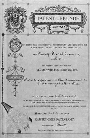 Rudolf Diesel (1858–1913) obdržel 28. února 1892 německý patent číslo 67 207 s názvem „Způsob práce a druh provedení spalovacího motoru“ (obr. 1.14). Diesel předpokládal, že jeho motor bude pracovat s účinností 70 až 80 % a s tlakem od 25 do 35 MPa. To také popsal ve své knize z roku 1893 Teorie a konstrukce racionálního tepelného motoru. Později neuváženého publikačního činu litoval a ověřil si, že je potřeba nejdříve usilovně pracovat, a až poté psát články.