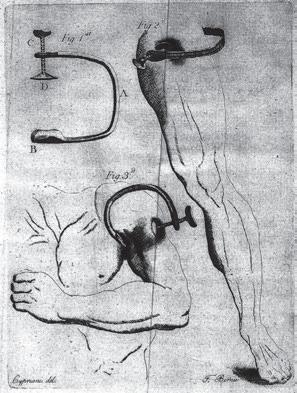 Obr. 1.1 Vyobrazení z knihy „A Method of Preventing or Diminshing Pain in Several Operations of Surgery“, v níž James Moore popsal kompresi nervů a nervových pletení