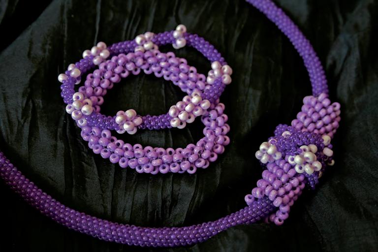 A tak jsem se rozhodla pro nádhernou vinutou perličku vyrobit náhrdelník podobný šňůrce ze skleněných rokajlů šitý do kruhu v barvě ladící s perlí z řad po pěti korálcích peyotovým stehem. Vlasec, kterým se další korálky přišívají k již zajištěným, opisuje při přišívání dalších korálků spirálu. Výsledek se povedl a inspiroval k vytvoření kolekce několika souprav se společným jmenovatelem: korálky šité do spirálky peyotovým stehem s lichým počtem v jedné řadě.