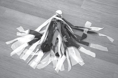 Materiál: šustivé igelitové sáčky – nákupní tašky (Tesco, Hypernova…) nebo barevné pytle na odpad, uzávěr od PET lahví, provázek, nůžky.