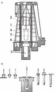 A – schéma zařízení: 1 – kroužek; 2 – otočná píšťala s elektromagnetem; 3 – hlubinná ohřívací pec; 4 – nosná konstrukce; 5 – vodicí lišty píšťaly při vertikálním pohybu; 6 – dvoudílná licí deska nad ohřívací pecí umožňující pohyb do stran; B – postup mechanického foukání válců podle Sieverta