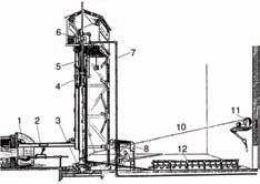 Obr. 2.4 Mechanické tažení válců podle Lubberse 1 – pracovní konec vany; 2 – lžíce; 3 – tažná pánev; 4 – výtah pro záchytný prstenec; 5 – teleskopické vedení přívodu vzduchu; 6 – kónický navíjecí buben; 7 – pevné vzduchové potrubí; 8 – budka pro obsluhu; 9 – ovládací prvek pro obsluhu; 10 – lano pro překlopení válců; 11 – naviják lana; 12 – lůžko pro ukládání válců