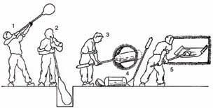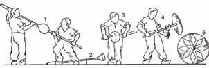 Obr. 2.1 Tvarování plochého skla ručním foukáním 1 – foukání baňky; 2 – vytvarování válce foukáním a komíháním; 3 – přihřívání válce během tvarování; 4 – opukávání; 5 – rovnání v rovnací peci