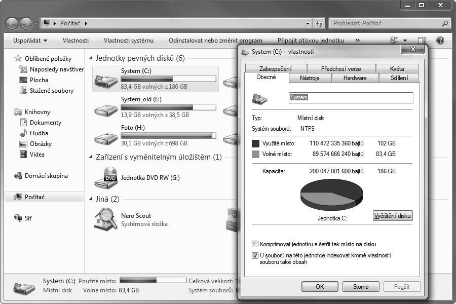 Otevře se okno Počítač, v němž dostanete přehled všech disků včetně využití jejich kapacit – viz obrázek 1.2. Přesné informace získáte, když z místní nabídky na ikoně disku zadáte příkaz Vlastnosti v dalším dialogovém okně; i toto okno můžete vidět na obrázku 1.2.