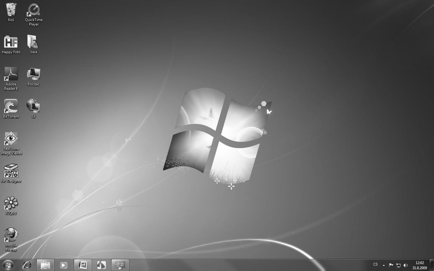 Úvodní obrazovka Windows 7 (viz obrázek 1.3) je v principu velmi jednoduchá a moc toho na ní neuvidíte. Celou ji vyplňuje pracovní plocha. Uprostřed najdete logo Windows, které vůbec není podstatné, vlevo nahoře najdete ikony Koše a vlastních dokumentů (ta je pojmenovaná vaším přihlašovacím jménem) a dole hlavní panel.