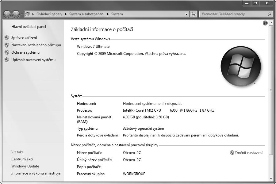 Otázka zní – jak zjistit výkon počítače? At máte v počítači jakýkoli systém Windows, postup je stejný. Klepněte na ikonu Počítač (Tento počítač) na ploše Windows pravým tlačítkem myši a z místní nabídky zadejte příkaz Vlastnosti. Otevře se okno Systém (nebo jemu podobné, ale se stejným obsahem) – viz obrázek 1.1. Informace o výkonu procesoru a kapacitě operační paměti tu máte jako na dlani. K zjištění kapacity disku na to musíte trochu jinak. Teď pro změnu na ikoně Počítač (Tento počítač) poklepejte.