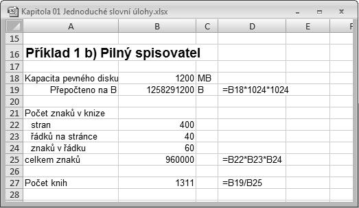 V první kapitole najdete jednoduché příklady, které spočívají v řešení prostých slovních úloh. Obvykle bývá složitější najít vlastní postup řešení příkladu než aplikovat toto řešení do vzorců Excelu.