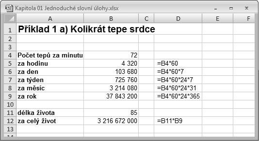 Vložte do buňky počet tepů za 1 minutu (nemusí to být zadaná hodnota, klidně si spočítejte, kolik toho vaše srdce dokáže). Potom tuto hodnotu postupně násobte příslušným počtem časových jednotek podobně jako na obrázku 1.1.