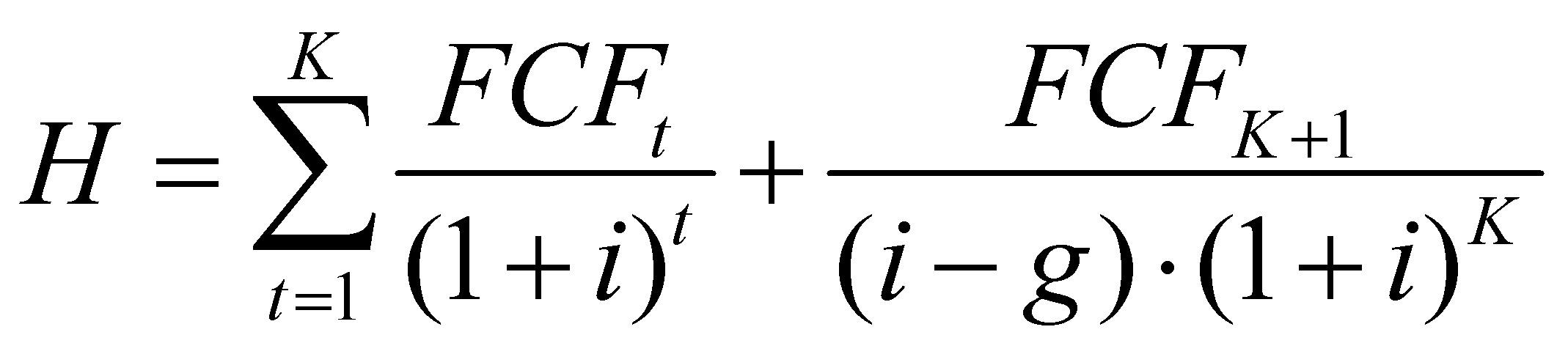 H – hodnota podniku (brutto), FCF – volné cash flow, generované podnikem v jednotlivých letech existence, i – diskontní sazba (kalkulovaná úroková míra, určená jako průměrné vážené náklady kapitálu),